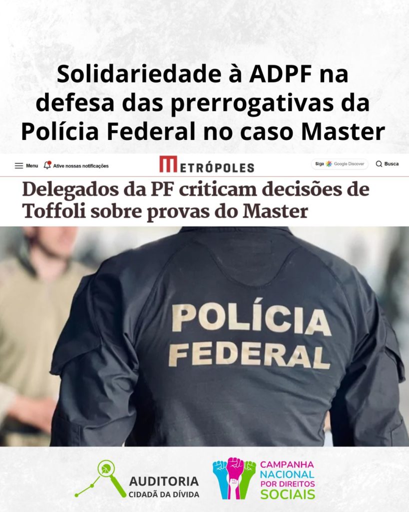 A Campanha Nacional por Direitos Sociais manifesta solidariedade à Associação Nacional dos Delegados de Polícia Federal (ADPF) e aos servidores concursados da Polícia Federal diante das recentes decisões que restringem a atuação institucional da PF no caso envolvendo o Banco Master.