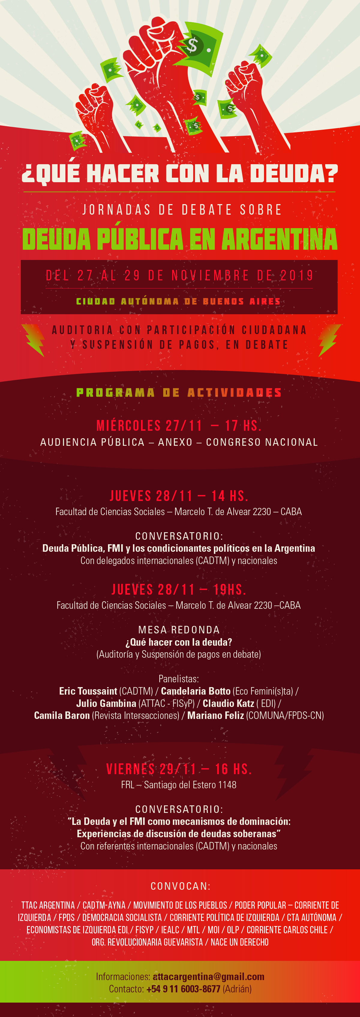 Entre os dias 27 e 29 de novembro, representantes do Comitê pela Anulação das Dívidas Ilegítimas (CADTM), da Auditoria Cidadã da Dívida (ACD), movimentos sociais, instituições de pesquisa, parlamentares e intelectuais discutiram, em Buenos Aires, a dívida pública argentina e propostas para uma solução soberana.