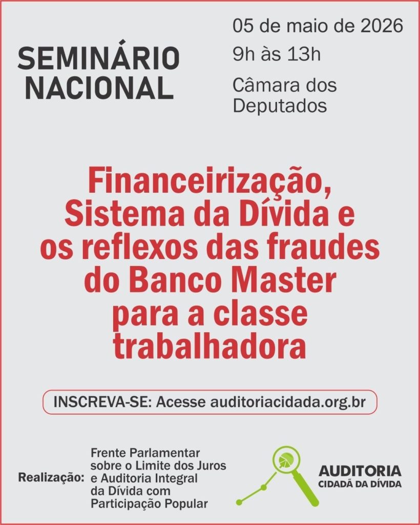 O seminário “Financeirização, Sistema da Dívida e os reflexos das fraudes do Banco Master para a classe trabalhadora”, irá reunir especialistas, parlamentares e representantes da sociedade civil para uma análise crítica e aprofundada sobre o tema.
