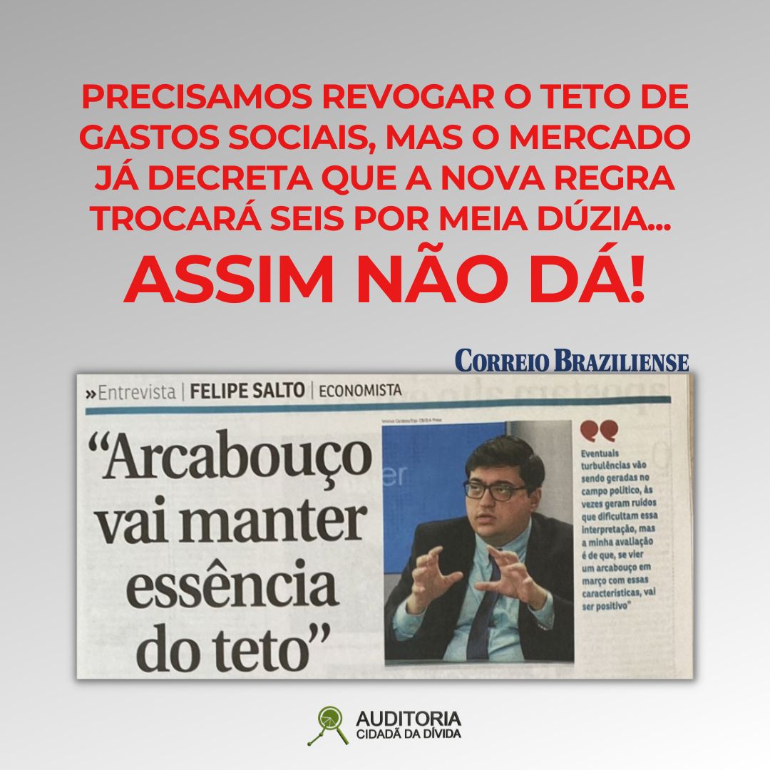 Manter a essência do teto de gastos para seguir privilegiando o pagamento de juros e amortizações da dívida pública é tudo o que não precisamos. Já está mais que comprovado que a dívida não cresce devido aos gastos sociais, mas sim por diversos mecanismos financeiros denunciados constantemente pela Auditoria Cidadã da Dívida (ACD), envolvendo principalmente a política monetária do Banco Central e as altas taxas de juros!