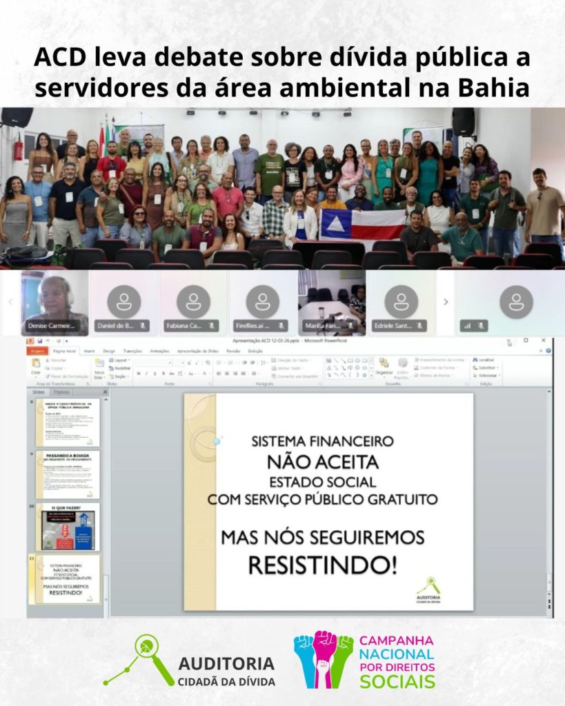 A Auditoria Cidadã da Dívida (ACD) participou do III Encontro Estadual dos Servidores da Secretaria do Meio Ambiente (SEMA) e do Instituto do Meio Ambiente e Recursos Hídricos (INEMA), realizado na cidade de Paulo Afonso (BA), com uma análise sobre o orçamento público e o sistema da dívida. A palestra magna “Valorização do Servidor, Participação e Fortalecimento da Gestão Pública” foi apresentada, de forma virtual, por Denise Carneiro, coordenadora do Núcleo da ACD na Bahia.