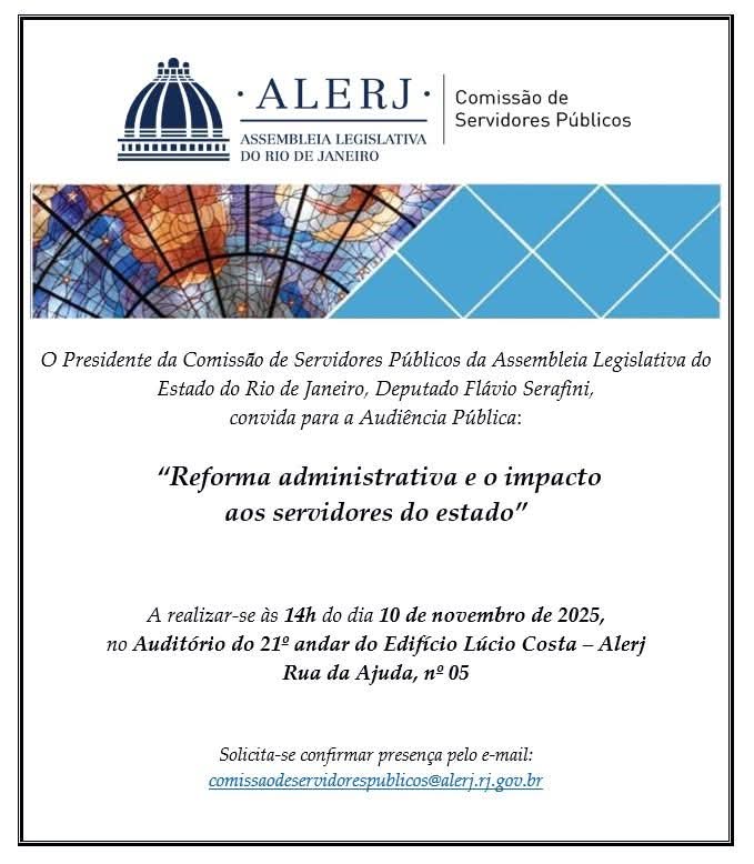O Presidente da Comissão dos Servidores Públicos da Assembleia Legislativa do Estado do Rio de Janeiro, o deputado estadual Flávio Serafim. Convida o diretor da Executiva Nacional da ASSIBGE-SN, Coordenador do Núcleo Sindical Canabarro e Coordenador da Auditoria Cidadã da Dívida Núcleo RJ para participar da Audiência Pública sobre: “A Reforma Administrativa e os impactos aos servidores do estado”. Dia 10 de novembro de 2025, as 14 horas, na ALERJ – Centro do Rio de Janeiro.