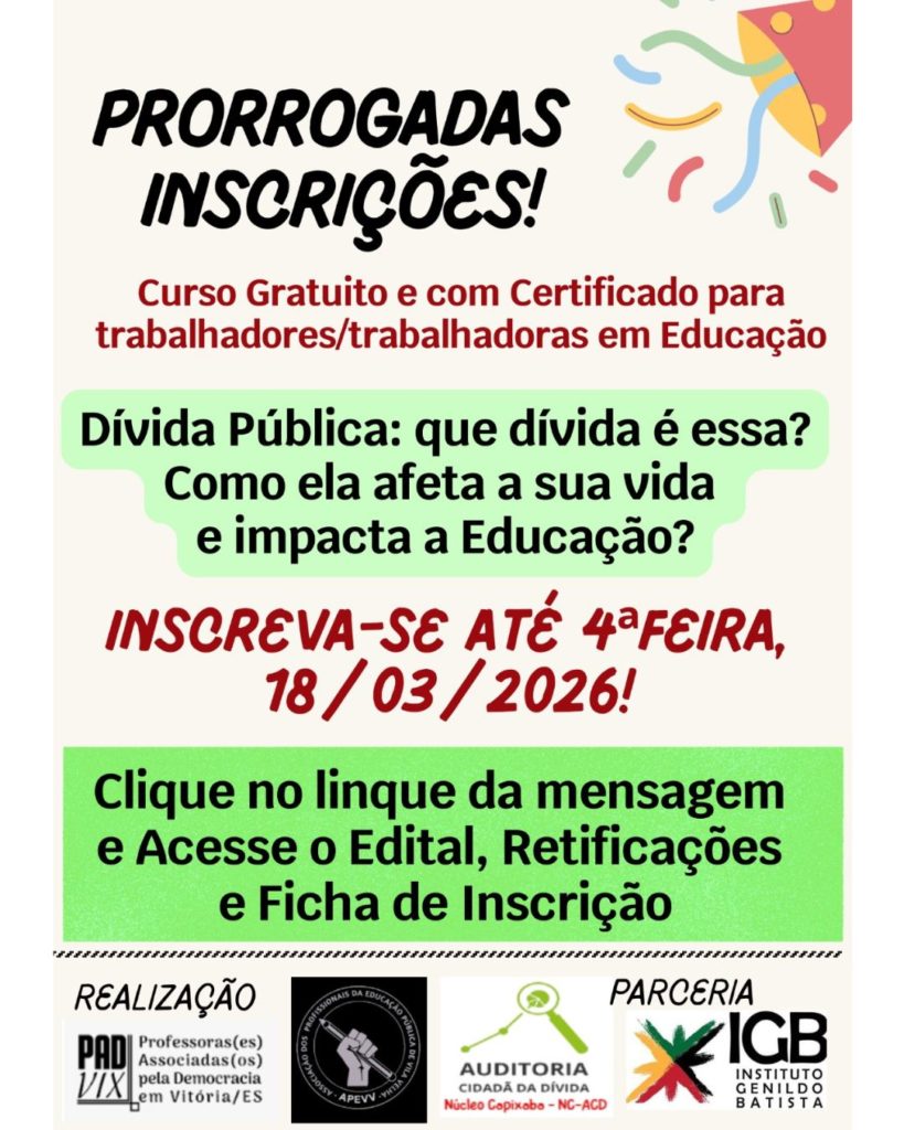As inscrições para o curso “Dívida Pública: que dívida é essa? Como ela afeta a sua vida e impacta a Educação?” foram prorrogadas para até o dia 18/03. O curso é uma iniciativa da PAD-VIX (Professores Associados pela Democracia) e da APEVV (Associação dos Profissionais da Educação de Vila Velha) em parceria com o Núcleo Capixaba da Auditoria Cidadã da Dívida (NC-ACD) e o Instituto Genildo Batista (IGB).