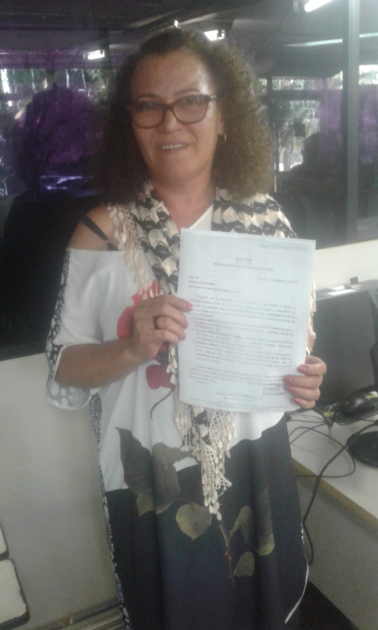 (Na foto à esquerda, o requerimento; na foto à direita, Maria Madalena Nunes, coordenadora do Núcleo PI, com o documento em mãos.)