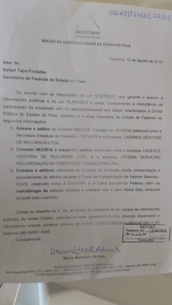 Na manhã de quinta-feira (15), integrantes do Núcleo Piauí da Auditoria Cidadã da Dívida encaminharam ao governo estadual requerimento de informações sobre o processo de “securitização de créditos” no estado do Piauí. A chamada “securitização de créditos”, apesar do que seu nome faz transparecer, é um esquema fraudulento de desvio da arrecadação tributária – que sequer passa pelos cofres públicos. Confira: