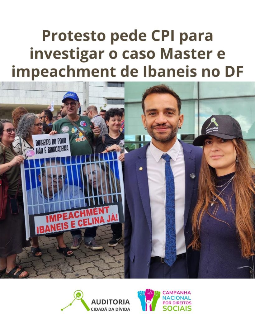 O Núcleo DF da Auditoria Cidadã da Dívida esteve presente no protesto, representado por Juliana Lima (na foto ao lado do deputado Fábio Felix), reforçando a denúncia sobre os impactos das operações financeiras e a necessidade de transparência e controle social. Mesmo com a ausência do governador, os manifestantes mantiveram a pressão, já que ainda faltam assinaturas para viabilizar a CPI do Banco Master.