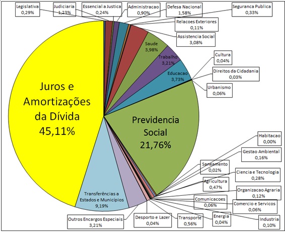 – As despesas com o serviço da dívida (juros mais amortizações, inclusive o refinanciamento), consumiram, somente no ano de 2014, 45,11% do Orçamento Geral da União, enquanto para a saúde foram destinados apenas 3,98%, para a educação 3,73% e para assistência social 3,08%. É evidente o privilégio à dívida pública, detida principalmente por grandes bancos, em detrimento do cumprimento dos direitos sociais básicos estabelecidos constitucionalmente: