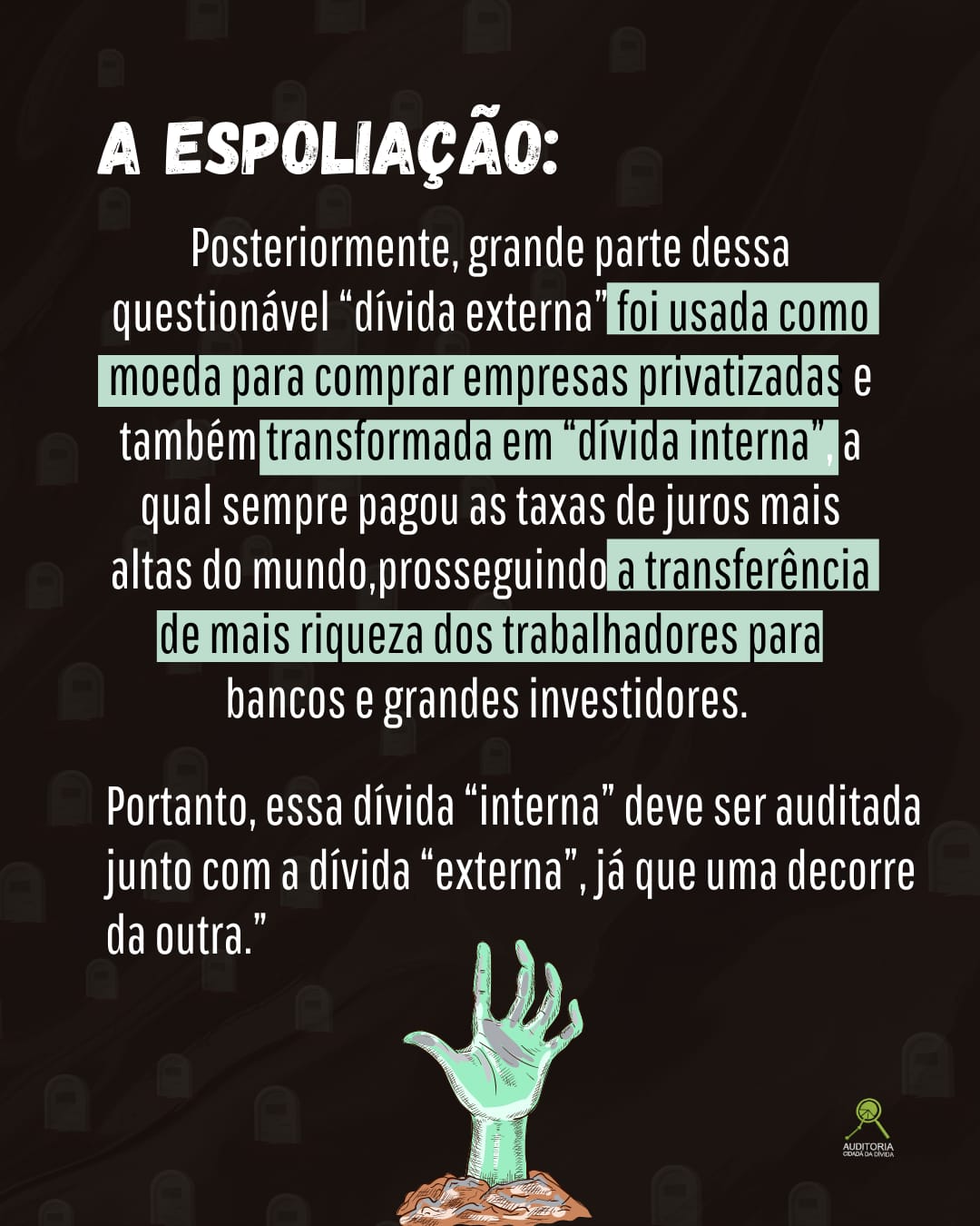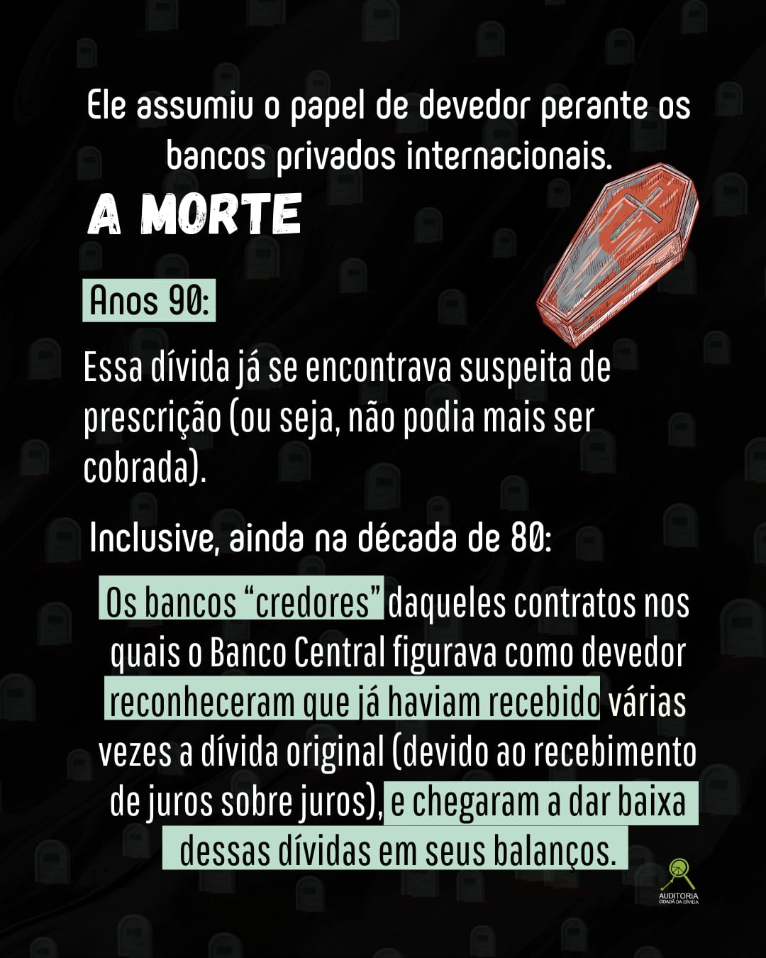 Essa jogada está entre os principais mecanismos que fizeram a Dívida Pública brasileira, como um cadáver reanimado, ser reativada e multiplicada sucessivamente, viabilizando, assim, a continuidade da rapina da população pelo Sistema da Dívida.